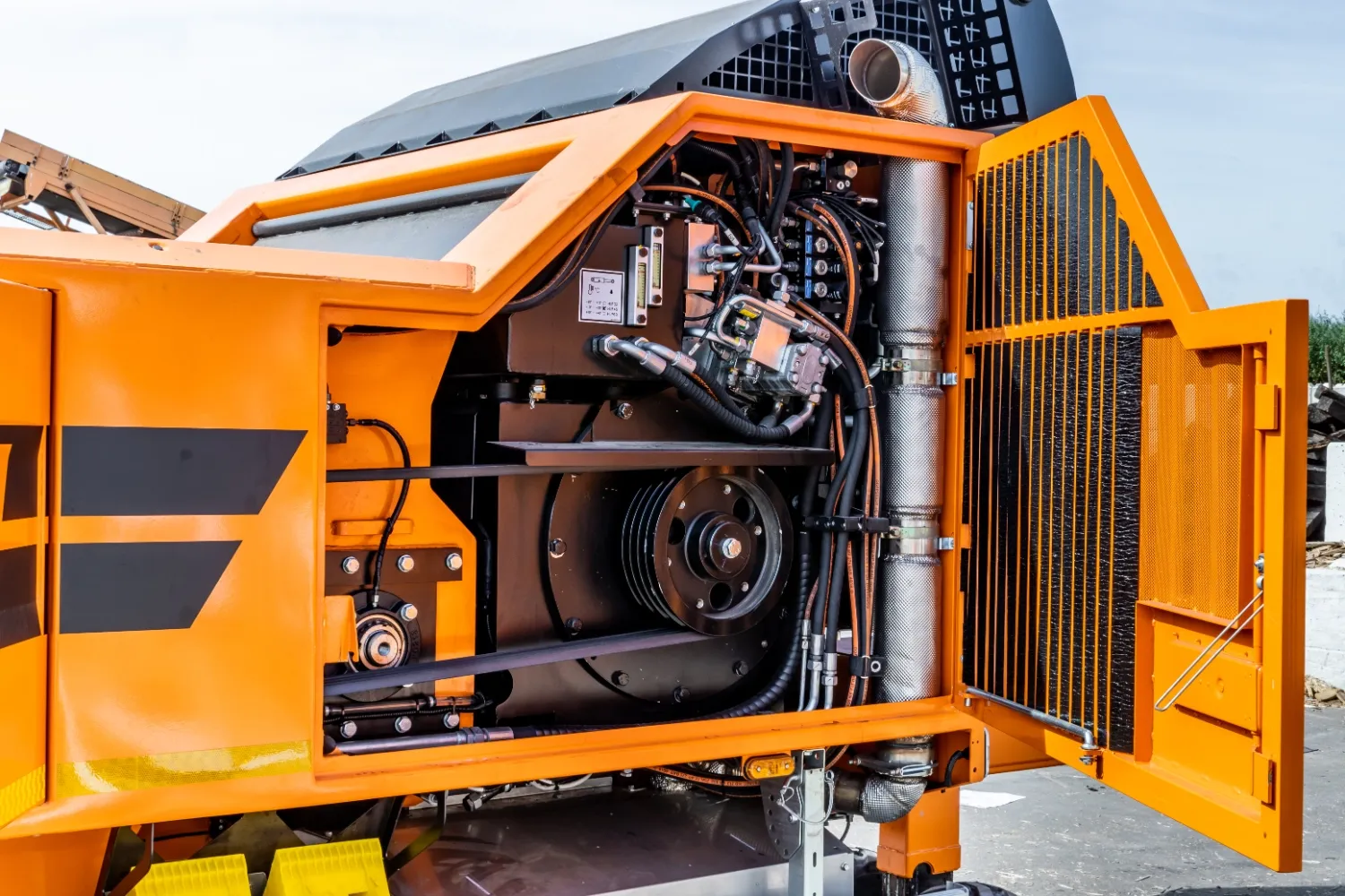 The optional lowerable rear discharge conveyor is hydraulically controlled for easy extension and retraction, and it can be fully lowered to enable maintenance work to be performed on the flail drum. Its discharge height of more than 3.5 m makes for easy transfer of shredded material to downstream machines or containers.